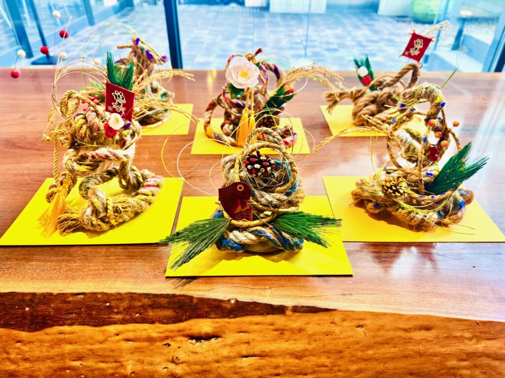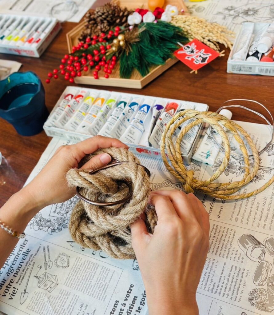 一本の縄()から生まれる様々な動きを発見し、空間を捉えながら造形します。生け花の要素を楽しみながら斬新な正月飾りをつくりましょう。