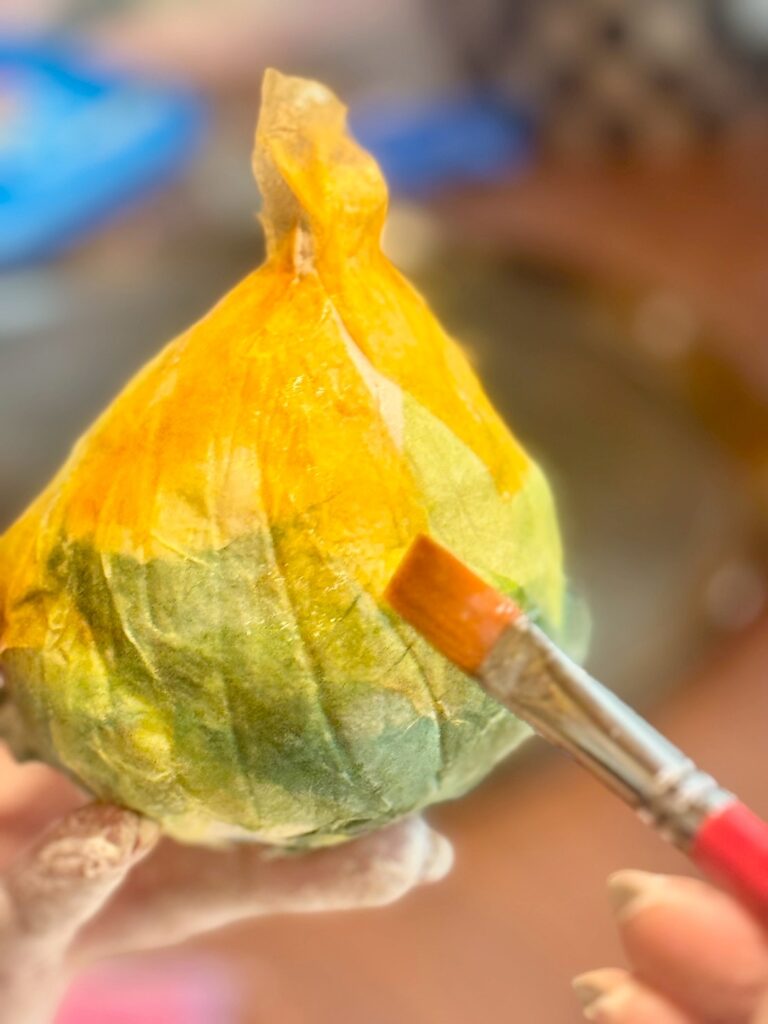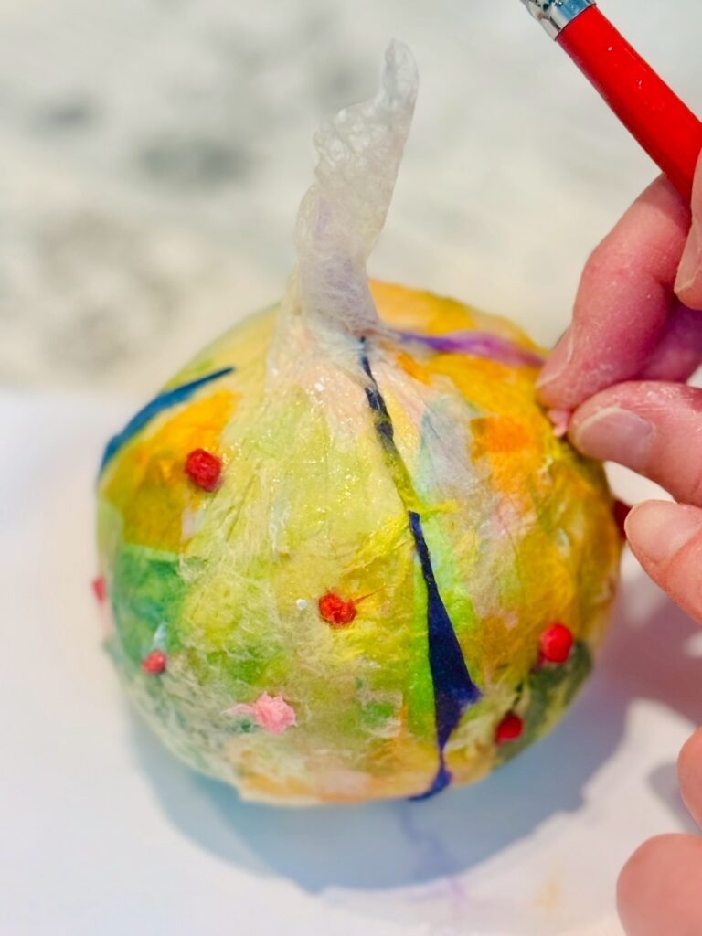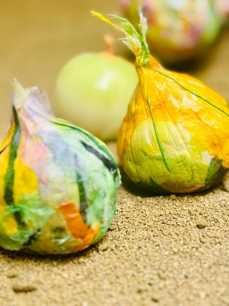 玉ねぎの模様、色、手触りを五感で感じながら自分だけの玉ねぎを制作します。粘土や和紙を使い、玉ねぎから感じたものを自由に立体表現します。