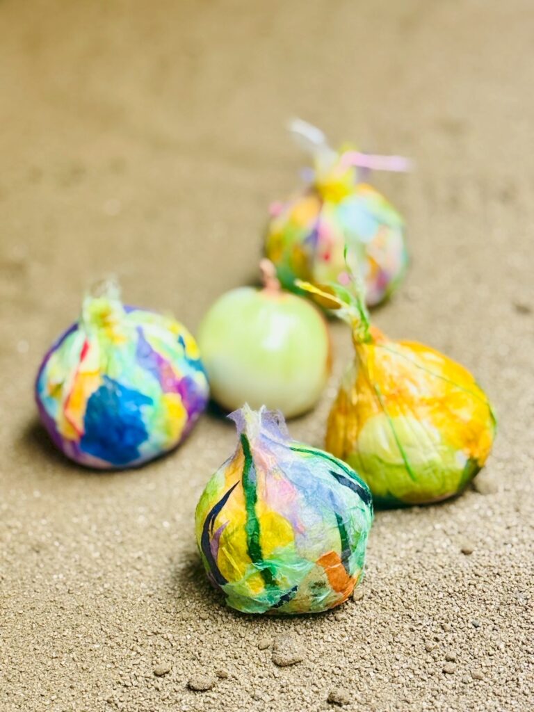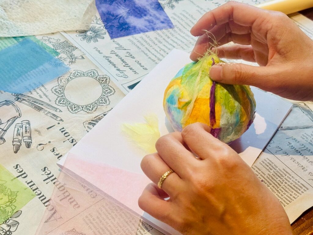 玉ねぎの模様、色、手触りを五感で感じながら自分だけの玉ねぎを制作します。粘土や和紙を使い、玉ねぎから感じたものを自由に立体表現します。
